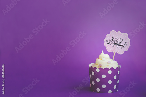 Unlimited access to 500+ planner templates happy birthday violet. Tasty strawberry cupcake with sprinkles and happy birthday banner on violet background.